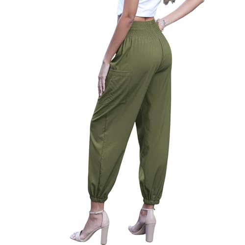 Womens Casual Boho Pants Elastic High Waist Loose Fit Long Pants Smocked Cargo Business Summer Pant with Pockets 2025 2