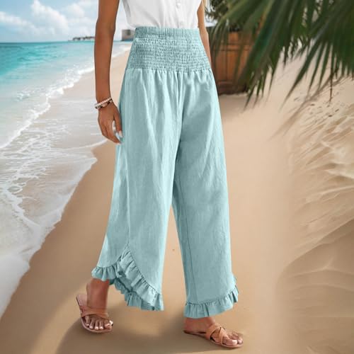 HOT ! Summer Pants for Women Wide Leg Pants Woman Casual Smocked High Waist Flowy Ruffle Hem Capris Beach Vacation Boho Trousers Light Blue