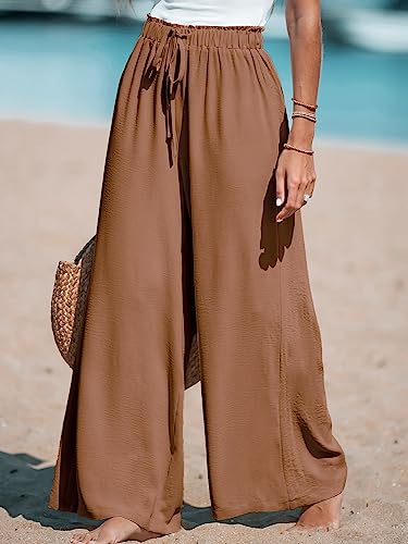 HOT ! CUPSHE Women Wide Leg Pants High Waisted Trousers Linen Palazzo Lounge Beach Cover Ups Flowy Pants,L Brown