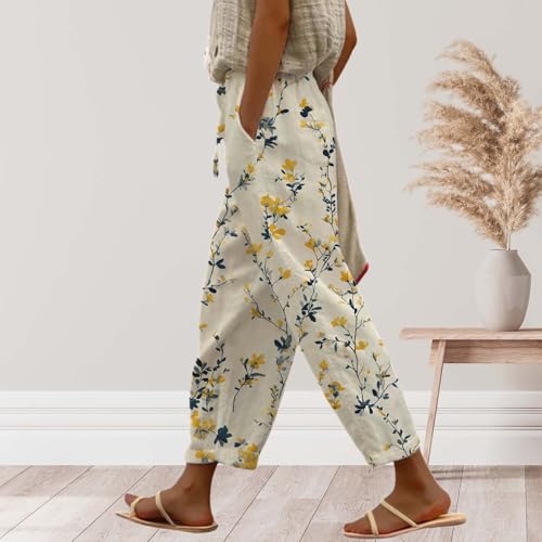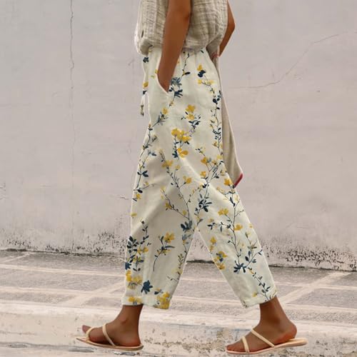 HOT ! Cotton Linen Pants for Women Casual Capri Elastic Waist Pants Vacation Beach Cropped Trousers with Pockets