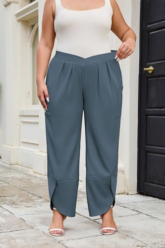 AOVDE Womens Plus Size Palazzo Pants Baggy Wide Leg Pants Elastic Crossover Waist Pleated Front Trousers with Pockets 4
