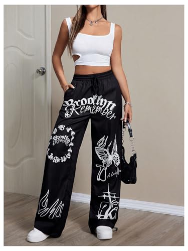 HOT ! Verdusa Women's Hip Hop Letter Graphic Pants Drawstring High Waisted Straight Leg Trousers