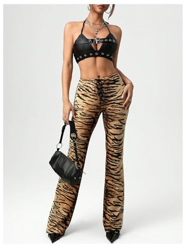HOT ! MakeMeChic Women's Leopard Print Pants Lace Up Bell Bottom Flare Y2k Trousers