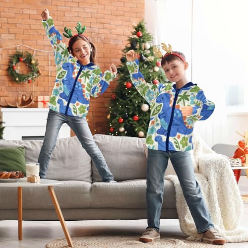 Blue Dinosaurs Among Green Plants Toddler Fleece Jacket Girl Boys Hooded Fleece Jacket Coat Warm Outwear Zip-up 3-10T 4