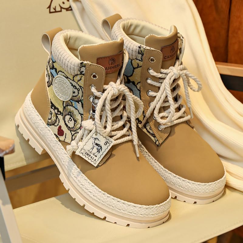 Designer Combat Boots with Teddy Bear Pattern, Lace-Up Platform Ankle Boots, Available in Beige, White, Black, Canvas Leather 7