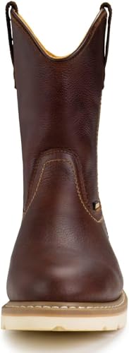 • Time tested goodyear welt construction provides superior wear resistance and moisture seal between upper and midsole making these extremely dependable and long-lasting mens pull on work boots.Reinforced stitching enhances durability and reduces the risk of sole separation.Rubber slip-resistant outsole outperforms other competitors with more flexibility, absorbing more impacts and gives your feet and ankles more protection while working on flat,wet,oily surfaces and loose gravel.
