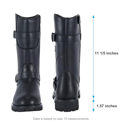 • Protective & Convenient - Constructed with premium waterproof PU leather and full-length thick fabric lining, the mens motorcycle riding boots provide calf-high protection while riding. Quality thick upper will shield your feet and lower legs from road debris and impact. PU leather upper and removable insole are easy to clean. A durable side YKK zipper with dual metal buckle straps ensures a secure fit and makes them easy to put on and take off.