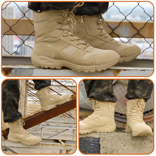 • PROTECTION & CONVENIENT: Side zipper design for quick on/off and lacing system with sturdy metal eyelets for adjustable firmness for secure and fit. Gusseted tongue to prevent pebbles, sand, mud and other debris from entering this tactical boots