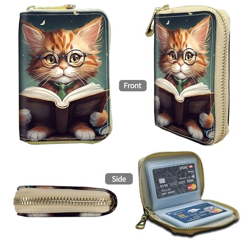 Credit Card Holder for Women Ladies Girls, Small RFID Blocking Wallet Zipper Wallet,Cute Leather Card Wallet Purse with 20 Slots Credit Card-Reading Cat 1