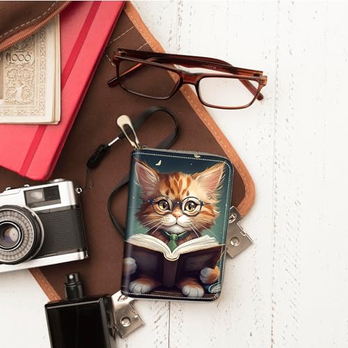 Credit Card Holder for Women Ladies Girls, Small RFID Blocking Wallet Zipper Wallet,Cute Leather Card Wallet Purse with 20 Slots Credit Card-Reading Cat 2