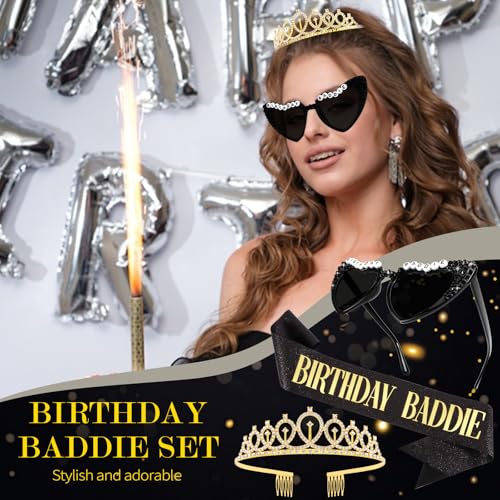 HOT ! Baddie Party Decorations for Women, Birthday Baddie Sash, Heart-shaped Sunglasses, Black Sash with Gold Foil for Birthday Accessories Party Favors Supplies