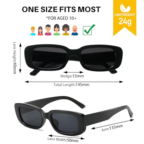 • Proper Size:The 90s sunglasses women total length of frame:15cm/6inch,the sunglasses in bulk legs:14.5cm/5.5inch,lens width and height:6.5cm/2.5inch,4cm/1.6inch,This size sunglasses pack fits most adults and youth,making them a memorable accessory for special occasions.Wearing these trendy sunglasses make you feel more relaxing, secure and fashion.