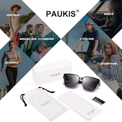 • TRUSTED POLARIZED UV400 PROTECTION: Highest level of UV filter to block almost 100% harmful sun rays and protect your eyes from UVA/UVB. Polarized anti glare and multi-layer UV coating lenses technology of Paukis professional uv sunglasses reduce glare reflected from road, water, snow, and other horizontal surfaces, relieve eye fatigue but improve the clarity of vision. Scratch resistant and shatterproof TAC lens prevent the damage to the eyes