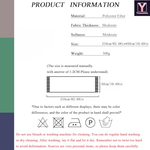 • [Sumptuous Texture]: Indulge in the opulent feel of the oversized scarf from Yoawdats, meticulously crafted from premium-quality polyester material for an exceptionally soft and velvety touch. This generously-sized scarf not only offers cozy warmth but is also conveniently packable, making it a perfect companion for your travel escapades. Embrace the crisp winter air with this lavish women's scarf that will cocoon you in unparalleled comfort and elegance.