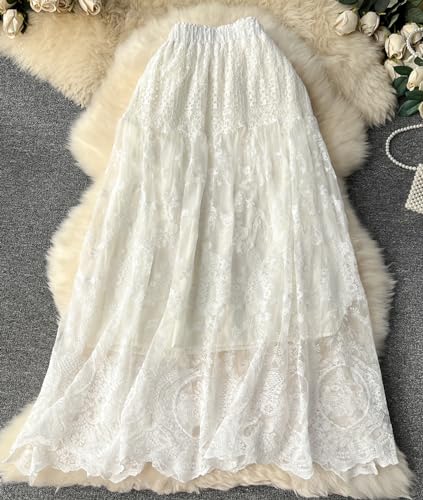 CHARTOU Women Embroidered Long Lace Maxi Skirt Sheer Tull Layered Skirt Crochet Mesh A Line Skirt Cotton Elastic Waist 1