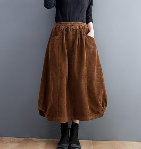 chouyatou Women's Elastic Waist Vintage Corduroy Skirt Button A-Line Swing Midi Long Skirt with Pockets 1