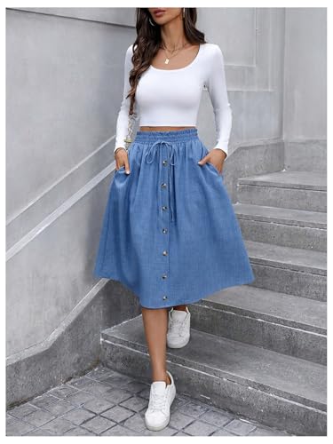 HOT ! Verdusa Women's Button Paperbag Drawstring Waist Skirts A Line Flowy Denim Midi Skirt with Pocket