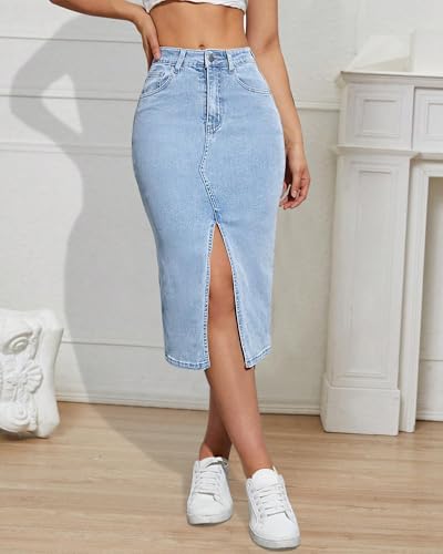 • 💡【Unique Front Slit Design】The slit adds a stylish touch to the women's skirts knee length, making it a great option for dressing up or down. The center slit of the denim pencil skirt allows for comfortable and easy movement, making it great for walking or other activities.