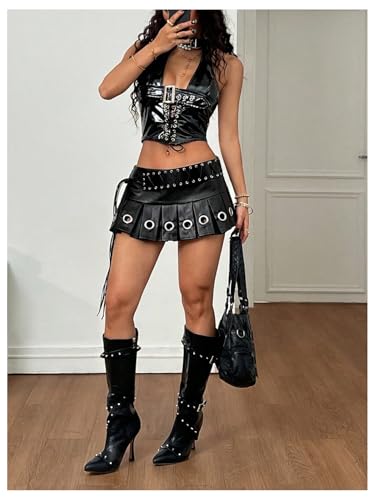 More information about WDIRARA Women's Y2k PU Leather Low Waist Mini Skirt Eyelet Grommet Pleated Skirts