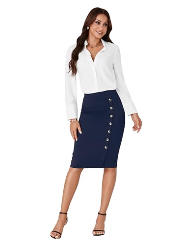LYANER Women's Basic Stretch High Waist Pencil Bodycon Button Knee Length Straight Office Midi Skirt 6