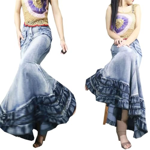 HOT ! Women's Tail Mermaid Denim Skirt Long Maxi Ruffle Swing A-Line Jean Maxi Skirt with Pockets