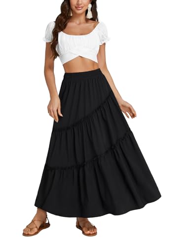• Features: Casual style. Tiered ruffle summer long maxi skirt with high waist, a-line, elastic waist, solid color design, creates a flattering and fashion look.