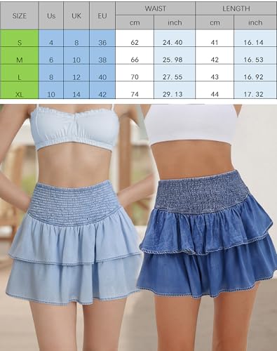 • Design: High waisted denim skirt; Womens mini jean skirt, tiered ruffled detail,solid color, smocked waist desigh, easy to pull on and take off; Easy to match with tank tops or shirts