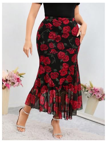 WDIRARA Women's Plus Size Floral Ruffle Hem Bodycon Midi Skirt Elastic Waist Fishtail Skirts 5
