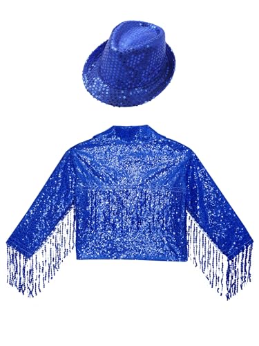 Hularka Kids Girls Sequins Long Sleeve Tassel Hip Hop Latin Disco Street Dance Jacket Coat Outwear with Hat Set 7