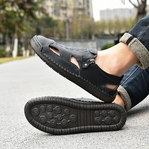 Men's Closed-Toe Leather Fisherman Sandals Slip-On | Breathable Comfortable Casual Moccasin Loafers for Summer Outdoor Driving & Walking | Side Zipper Hand-Sewn 5