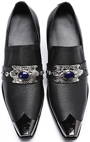 HOT ! Santimon Men's Slip-On Loafers Dress Shoes with Metal Toe Cap & Silver Skull Ornament – Black Block Heel Leather Punk Western Loafers for Wedding, Stage, Cosplay, Party