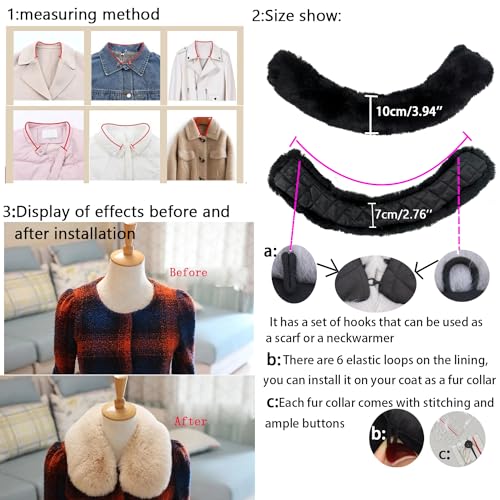 • Perfect Winter Collection:Our faux fur collar for hood is unisex and suitable for people of all ages.It can be matched with trench coat, down jackets, parka, ski jackets, hooded clothes, etc. It also has a hook design on the back, which can be used not only as a fur collar, but also as a scarf, which is particularly practical.