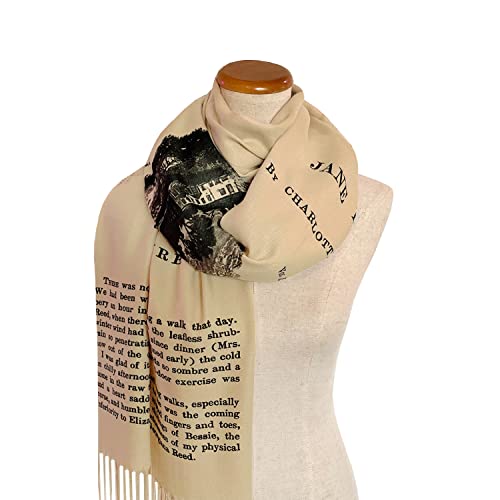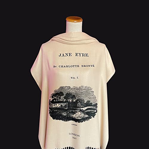 • A classic novel Jane Eyre written by Charlotte Brontë book pages printed on soft, beige colored acrylic shawl