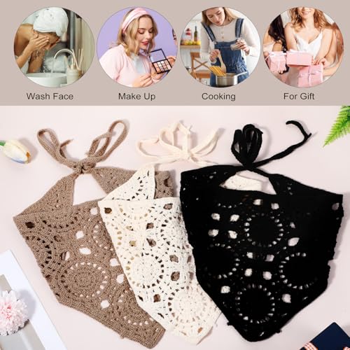3Pcs Crochet Bandanas Headbands Hair Accessories, Triangle Crochet Head Scarf, Hollow Knitted Floral Headscarf Vintage Head Kerchief for Women Girls Decor (Black, Beige, Gray) 7