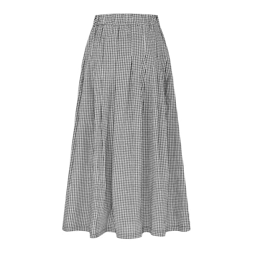 More information about HGps8w Vintage Plaid Cotton Linen Skirt for Women 2025 Fall Elegant Elastic High Waist Loose A-Line Swing Casual Maxi Skirts