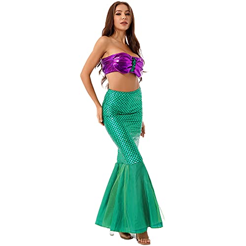 • Women Shiny Mermaid Role Play Costume Two-piece Outfit Strapless Padded Crop Top with Fish Scale Print Skirt