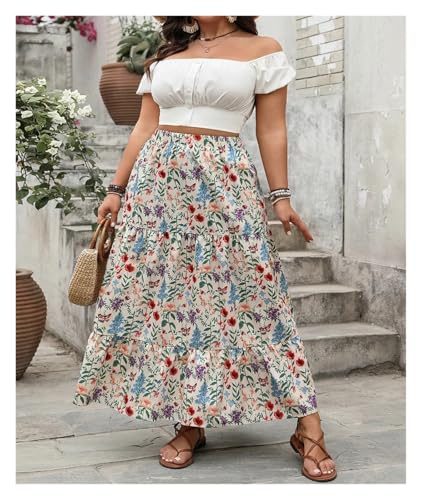 Chiffon Skirt Plus Size Floral Print Sweet Long Skirts Women Summer Elastic Waist Vacation Casual Big Swing A-Line Skirt for Chiffon(2XL) Multicolor 1