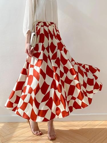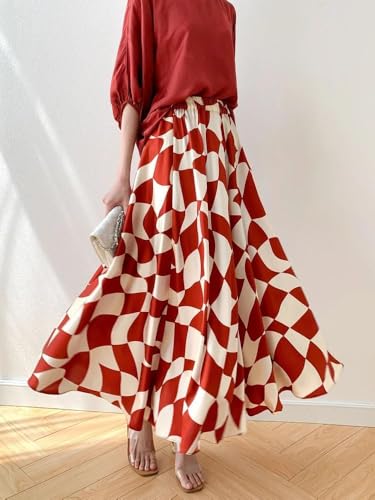 HOT ! Women's Mulberry Silk Plaid Midi A-Line Skirt with Elastic Waist Satin Casual Skirt