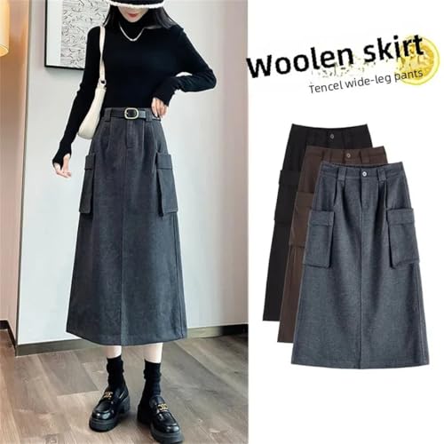 HOT ! Women's Winter High Waist Plus Size Midi Twill Large Pocket Side Slit Wool A-Line Skirt