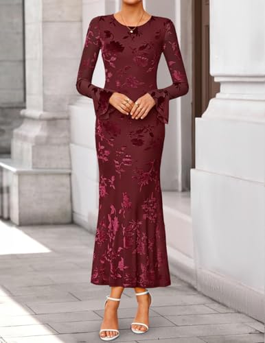 ZESICA Women's 2025 Bell Long Sleeve Floral Maxi Dress Fall Fashion Bodycon Mesh Wedding Guest Cocktail Party Dresses 4