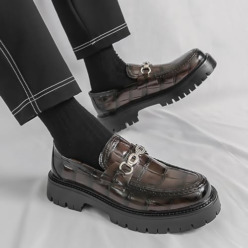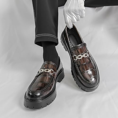 Men's Checkered Pattern Chain Platform Loafers Comfortable Non-Slip Lug Sole Business Formal Leather Shoes Patent Leather Wide Toe Work Casual Dress Shoes 6