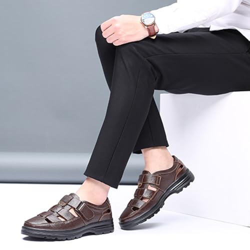 Large size fashion men's solid color retro head layer cowhide leather upper open toe sandals, comfortable non-slip hook-and-loop breathable beach shoes 6