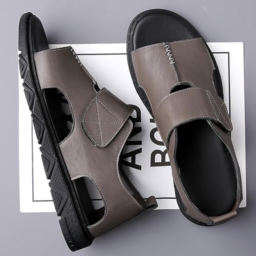 HOT ! Men's Leather Hand Stitching Hollow Out Sandals Summer Retro Comfort Round Open Toe Breathable Hook Loop Anti-Slip Flat Beach Sandals for Casual Outdoor Wading