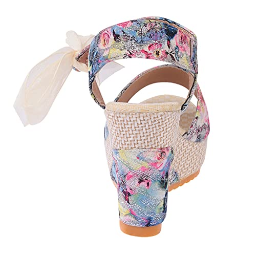 Women Platform Flat Sandals with Ribbon Wedge Ankle Buckle Strap Bowknot Shoes Floral Print Bohemian Beach Open Toe Espadrille Shoes 6