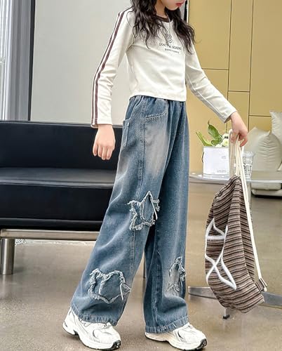 Viatabuna Girls Wide Leg Star Jeans Elastic Waist Pull On Jeans Baggy Denim Pants Youth Kids Clothes 5-14 Years 5
