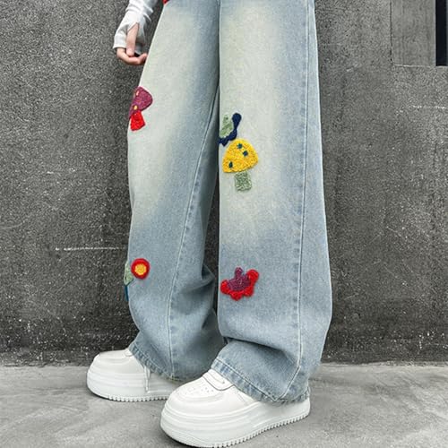 HOT ! Girls Chic Embroidered Patch Wide Leg Jeans Vintage Washed Elastic High Waisted Loose Denim Pants with Pockets for 3-14 Years