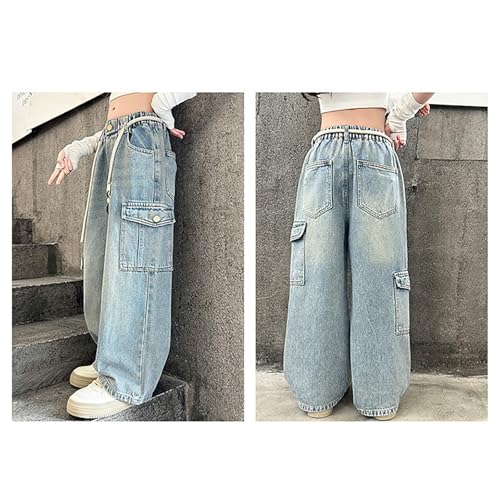 Wide Leg Cargo Pants Baggy 𝐃rawstring 𝐘2K Elastic Waist Jean Girls Straight Leg Denim Streetwear with Multi Poket 4