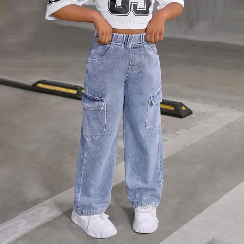 Girls Baggy Wide Leg Denim Pants Teen Elastic Waist Pant Kids Loose Washed High Waisted Denim Trouses with Pockets 6