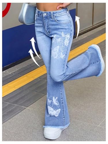 • Feature: Butterfly print, high waist, flare leg, ripped raw hem, denim jeans