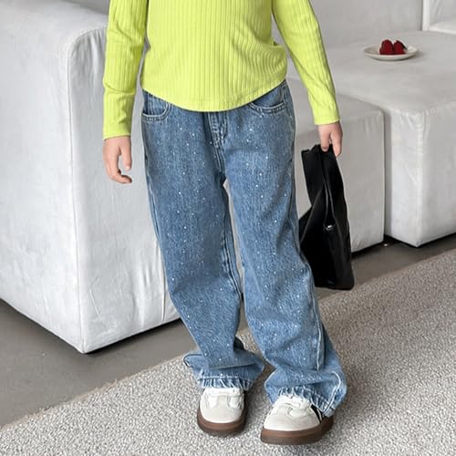 HOT ! Baggy Jeans for Girls Rhinestone Preppy Wide Leg Pants Adjustable Waist Pockets Cute Jeans for Girls Kids Coquette Age 11-12